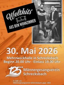 125 Jahre Männergesangverein Schrecksbach Wann 30.05.2026 00:00 Zum Kalender hinzufügen ICS herunterladen Google Kalender iCalendar Office 365 Outlook Live Veranstaltungstyp Allgemeine Veranstaltungen
