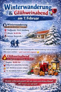 Winterwanderung vom Verschönerungsverein – 07.02.2026 Wann 07.02.2026 16:30 Zum Kalender hinzufügen ICS herunterladen Google Kalender iCalendar Office 365 Outlook Live Veranstaltungstyp Allgemeine Veranstaltungen Treffpunkt: DGH Holzburg – Burgstr. 3 in Holzburg Datum/Uhrzeit: 07.02.2026 – 16:30 Uhr