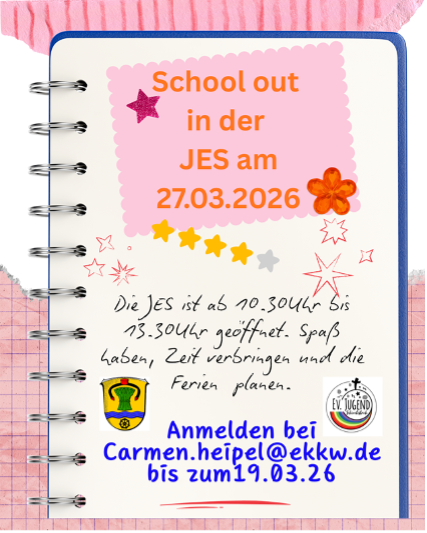 Am Freitag, den 27. März 2026, lädt die JES Schrecksbach zu „School out in der JES“ ein. Nach dem Schulvormittag können Kinder und Jugendliche hier gemeinsam Zeit verbringen, Spaß haben und entspannt in die Ferien starten.