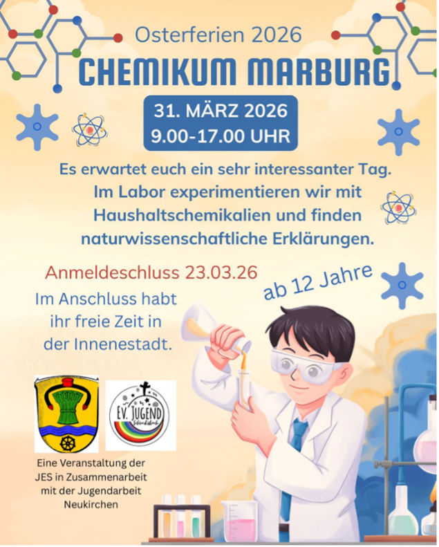 In den Osterferien 2026 lädt die JES Schrecksbach gemeinsam mit der Jugendarbeit Neukirchen zu einem spannenden Ausflug ins Chemikum Marburg ein. Am 31. März 2026 verbringen die Teilnehmenden einen erlebnisreichen Tag im Labor und entdecken die Welt der Naturwissenschaften.