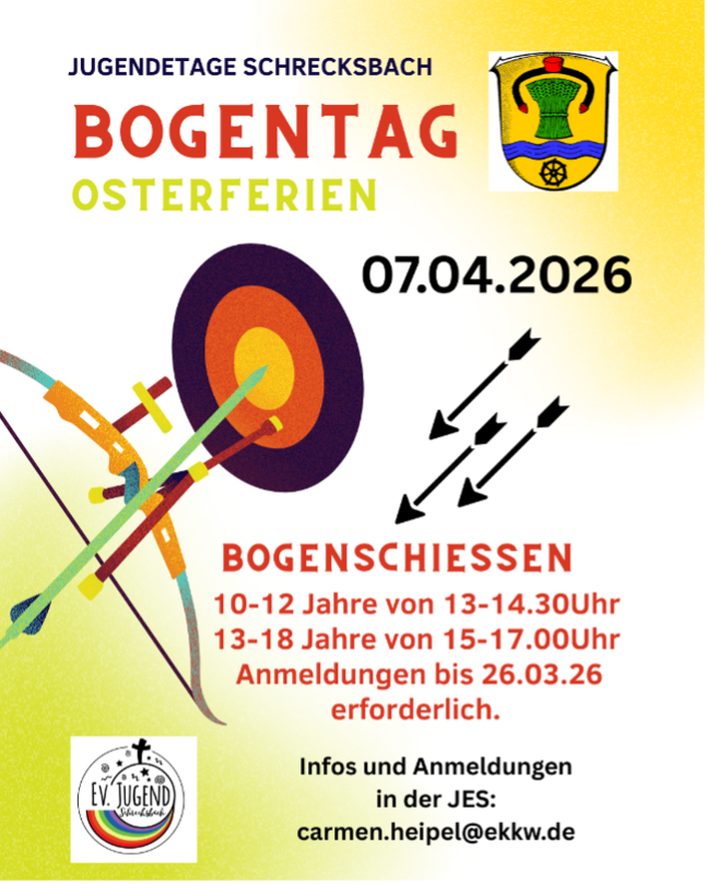 Im Rahmen der Jugendtage Schrecksbach findet in den Osterferien ein Bogentag statt. Am 7. April 2026 haben Kinder und Jugendliche die Möglichkeit, sich im Bogenschießen auszuprobieren und ihre Treffsicherheit zu testen.